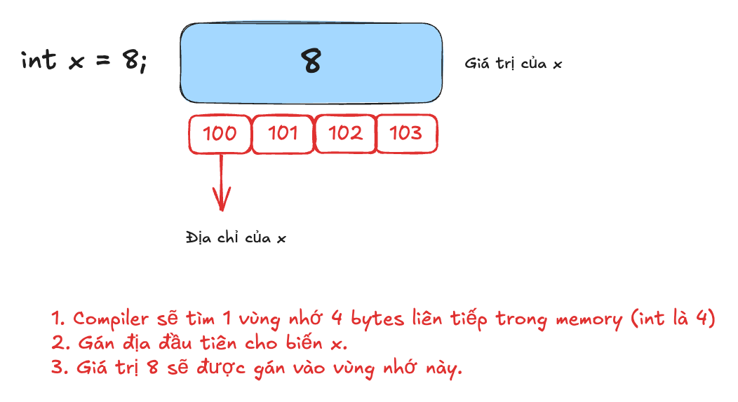 Lúc này, compiler sẽ tìm trong bộ nhớ chính (RAM) một vùng trống đủ lớn để lưu trữ một giá trị kiểu int. Trên hầu hết các hệ thống 16-bit, một biến int chiếm 2 byte; còn trên hệ thống 32-bit hoặc 64-bit hiện đại, một biến int thường chiếm 4 byte. Sau khi vùng nhớ này được cấp phát, địa chỉ của byte đ ầu tiên trong vùng nhớ đó sẽ được coi là địa chỉ của biến x  và giá trị 4 sẽ gán với địa chỉ này như hình minh họa bên dưới.